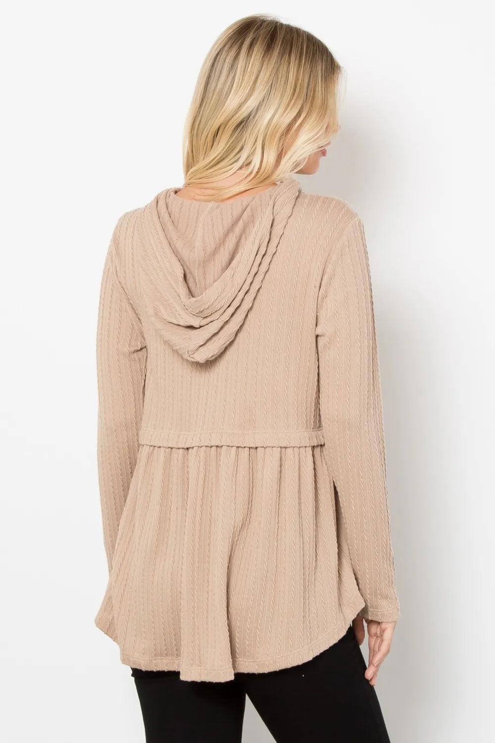 • Be Stage Full Size Long Sleeve Peplum Cable Knit Hoodie Be Stage Full Size Long Sleeve Peplum Cable Knit Hoodie