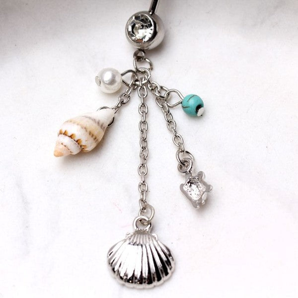 316L Surgical Steel Beach Charms Dangle Navel Ring Perfect for summer this funky belly ring brings to mind fun in the sun and an ocean breeze. Crafted out of the highest quality implant grade 316L Surgical Steel this press fit CZ gem curved barbell shows off a series of fun and summery charms on its multiple chains. This navel ring will compliment a bikini with ease with its cute Seashells, Tiny Turtle, and Bright bead designs. This piece is one of a kind!