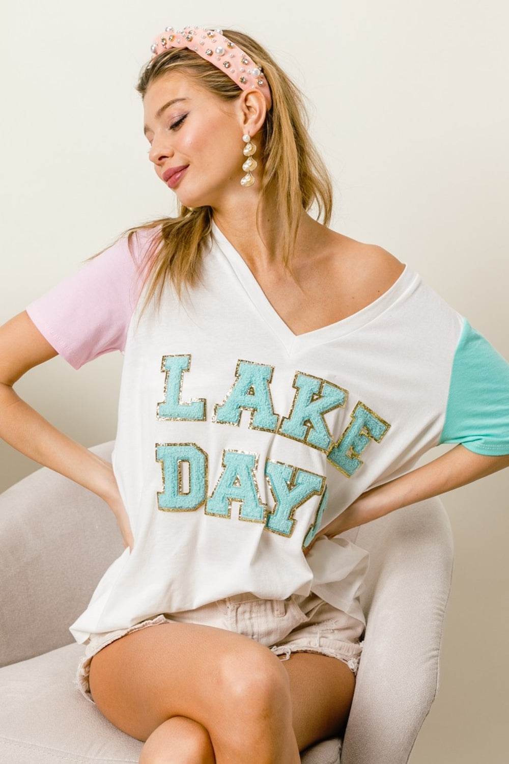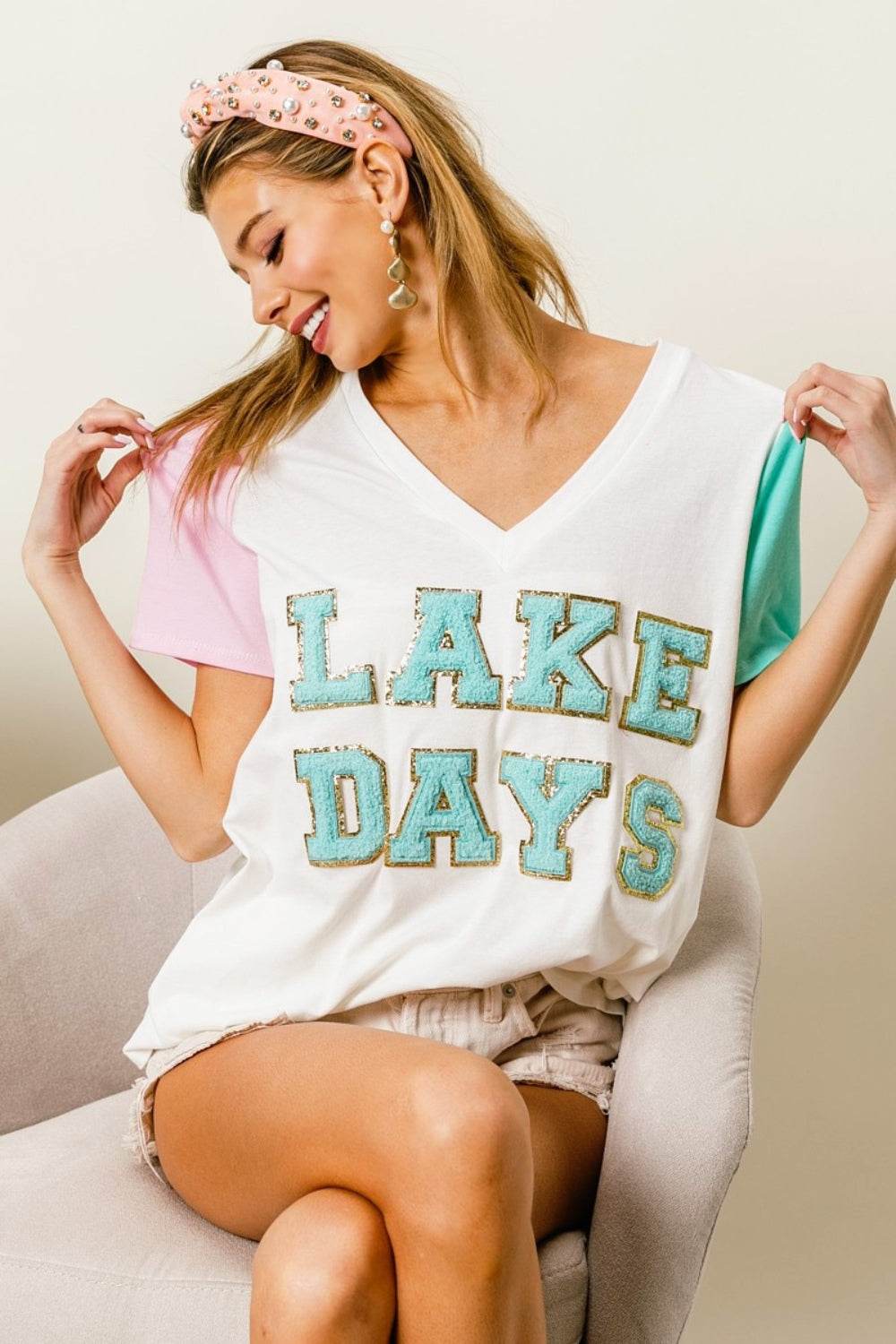 BiBi Letter Patch V-Neck Color Block Short Sleeve T-Shirt