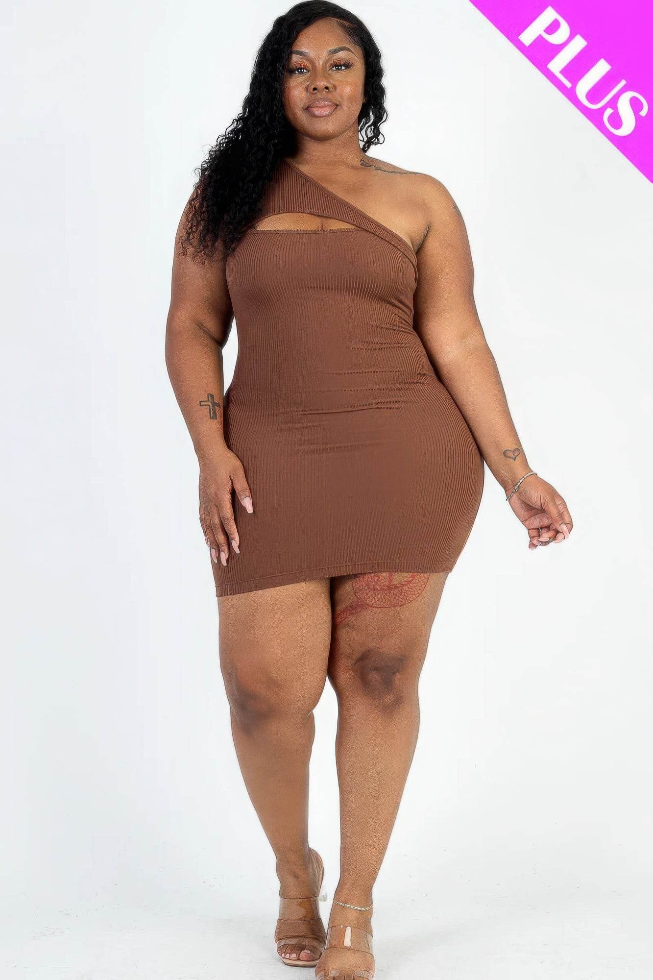 Elevate your style with our Plus Size Ribbed One Shoulder Cutout Front Casual Mini Bodycon Dress in Downtown Brown. This dress is designed to make a bold statement while offering a flattering fit and comfortable wear.