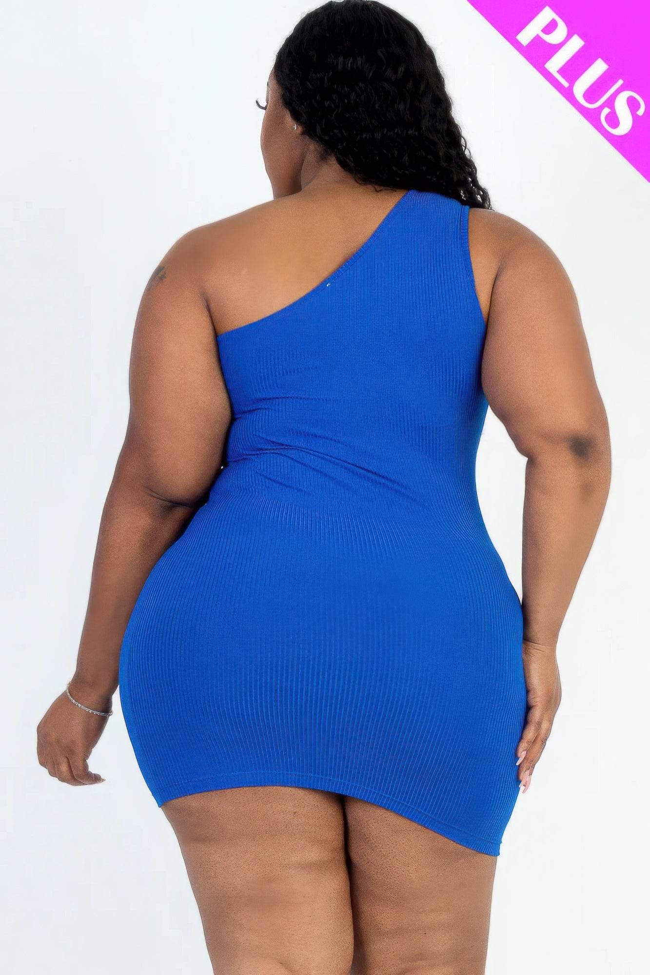 Add the Plus Size Ribbed One Shoulder Cutout Front Casual Mini Bodycon Dress in Royal to your cart today and experience the perfect blend of elegance and comfort!