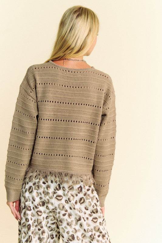 Davi & Dani Fringe Hem Openwork Drop Shoulder Knit Top