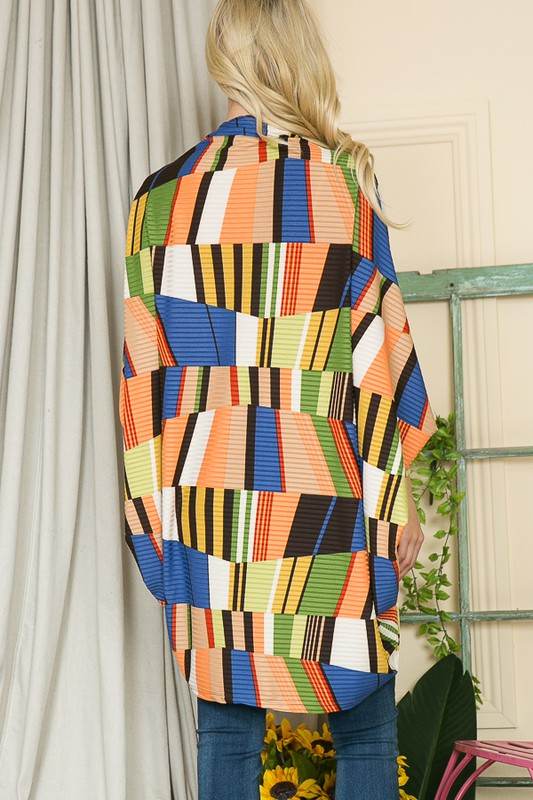 This dolman open-front cardigan from Datrend Store is the perfect addition to your wardrobe. Made in the USA, this cardigan features a unique geometric knit jersey print that adds a touch of style to any outfit. The dolman sleeves and sleeve band provide a comfortable and relaxed fit, while the open-front design allows for easy layering.