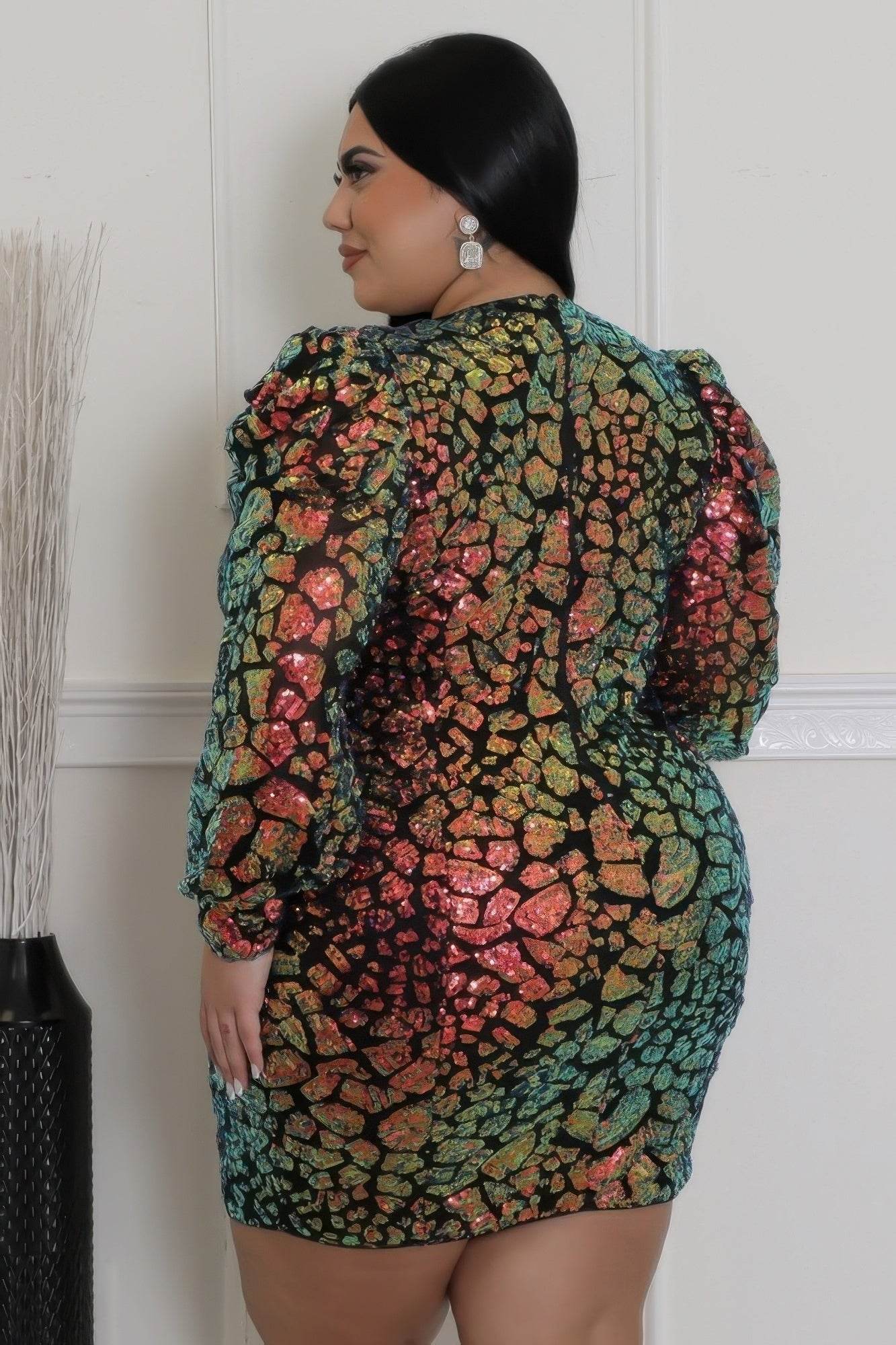 This dress offers the perfect balance of structure and sparkle, with its shimmering sequin design and tailored fit. The multi-colored sequins provide a bold, festive look that's sure to turn heads, making it an ideal choice for evening events, parties, and celebrations.