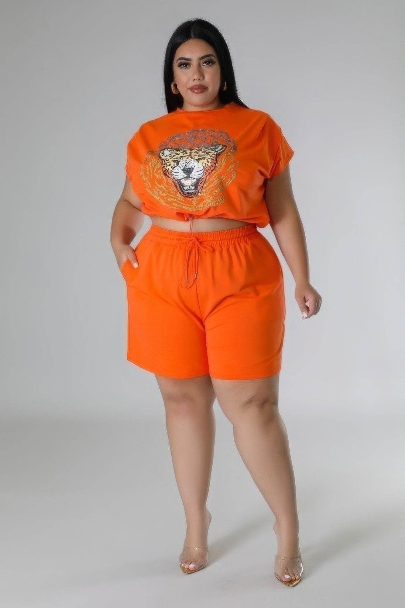 Enhance your wardrobe with our 1XL.2XL.3XL Stretch Short Set in Orange. Add it to your cart now and enjoy comfort, style, and a touch of sparkle!