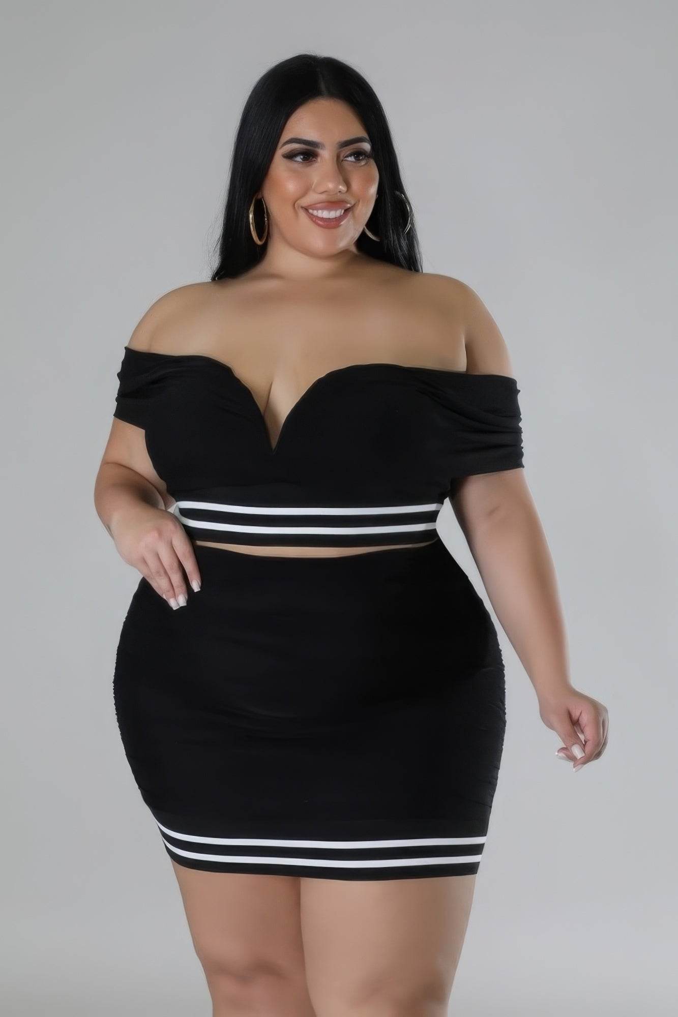 Introducing our Stretch Skirt Set in timeless Black, available in sizes 1XL, 2XL, and 3XL. This set features a blend of style and comfort with an off-the-shoulder design, sweetheart neckline, V-cut, breast padding, and a high-waisted skirt. Practical details include a zipper closure for easy wear, an elastic waistband for comfort, and elegant mesh accents.