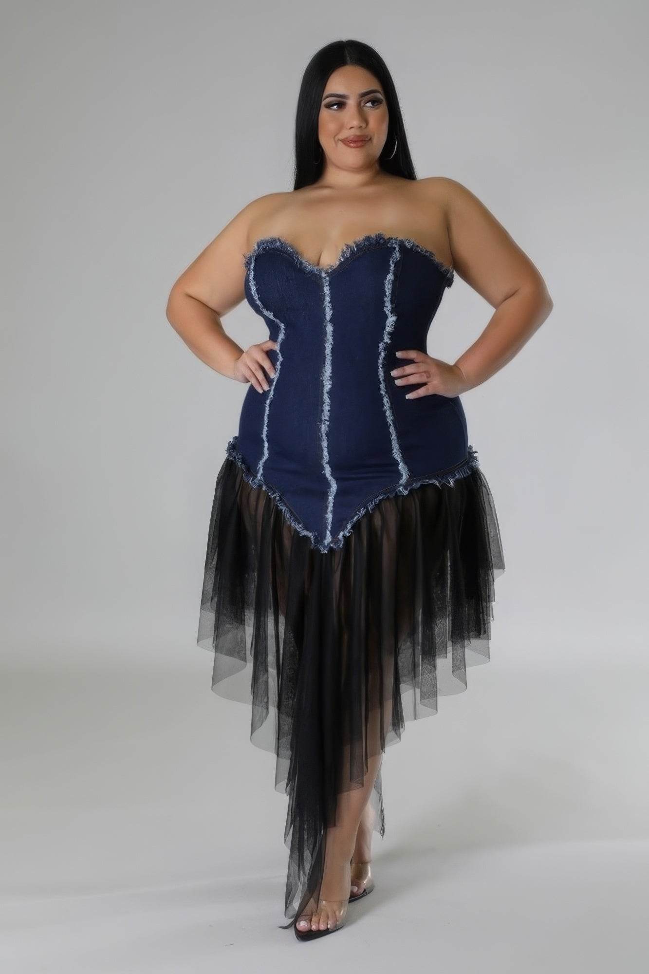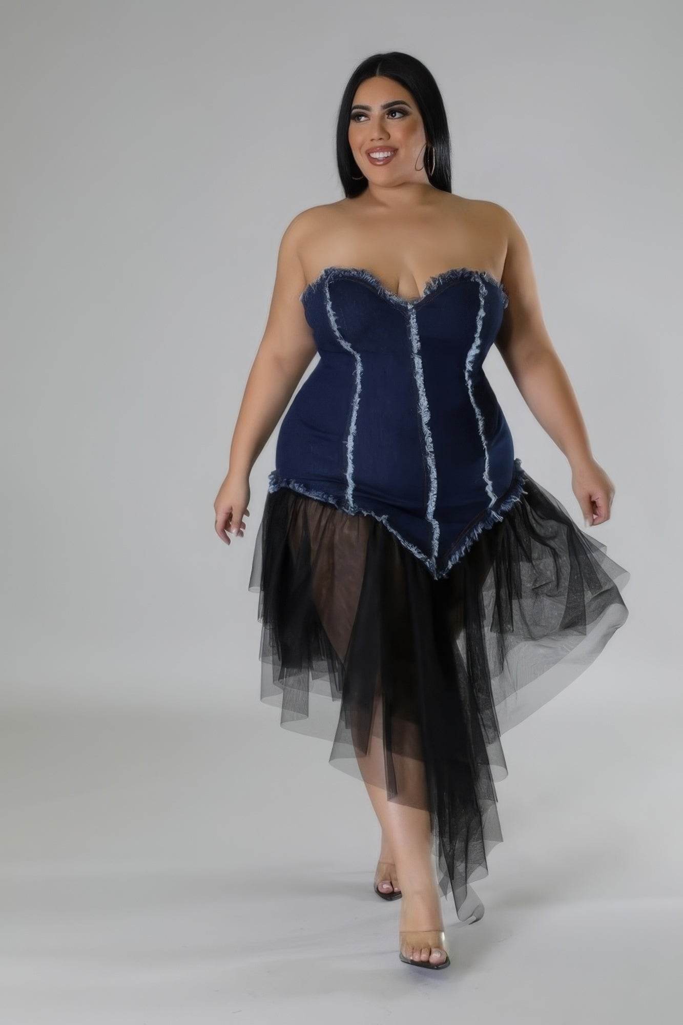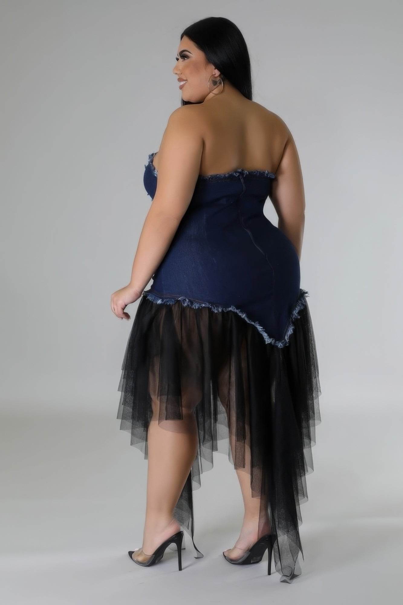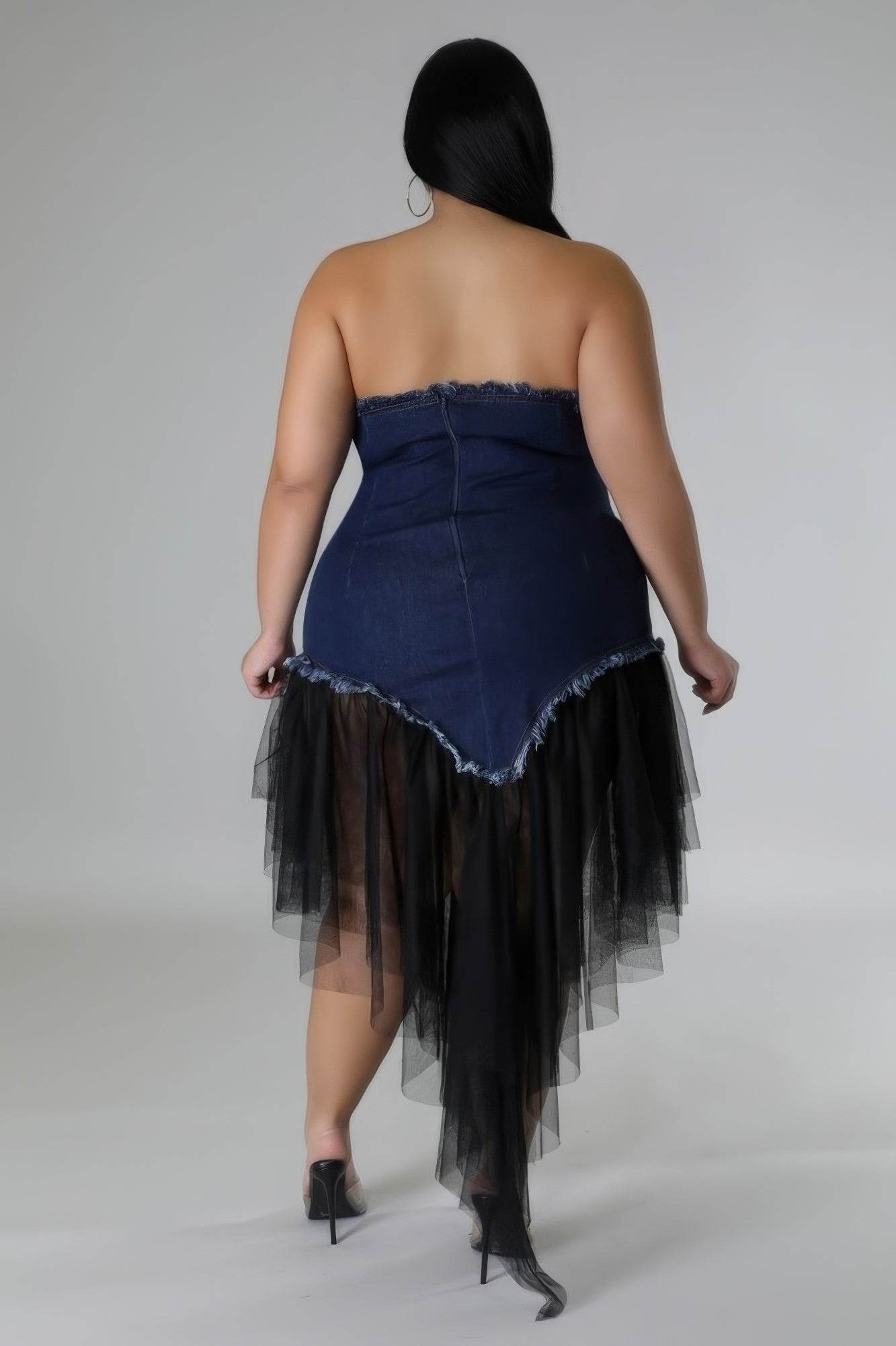 Introducing our Non-Stretch Denim Dress, available in sizes 1XL, 2XL, and 3XL. This dress combines a classic tube silhouette with a sweetheart neckline, denim fabric, tulle detailing, an asymmetrical hem, and a practical zipper closure. Crafted for both style and comfort, this dress is made from a blend of 65% Cotton, 30% Polyester, and 5% Spandex.