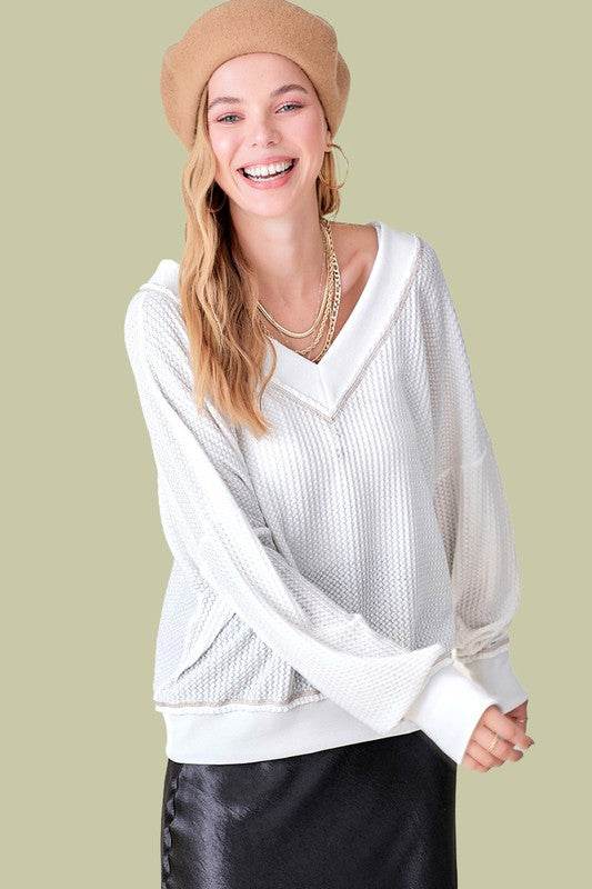 Much-loved Holly waffle top! Cut in an oversized fit featuring a low V neckline, lantern long sleeves with dropped shoulders for a cozy flattering look. We added stitch detailing all over to keep things more interesting and cute.