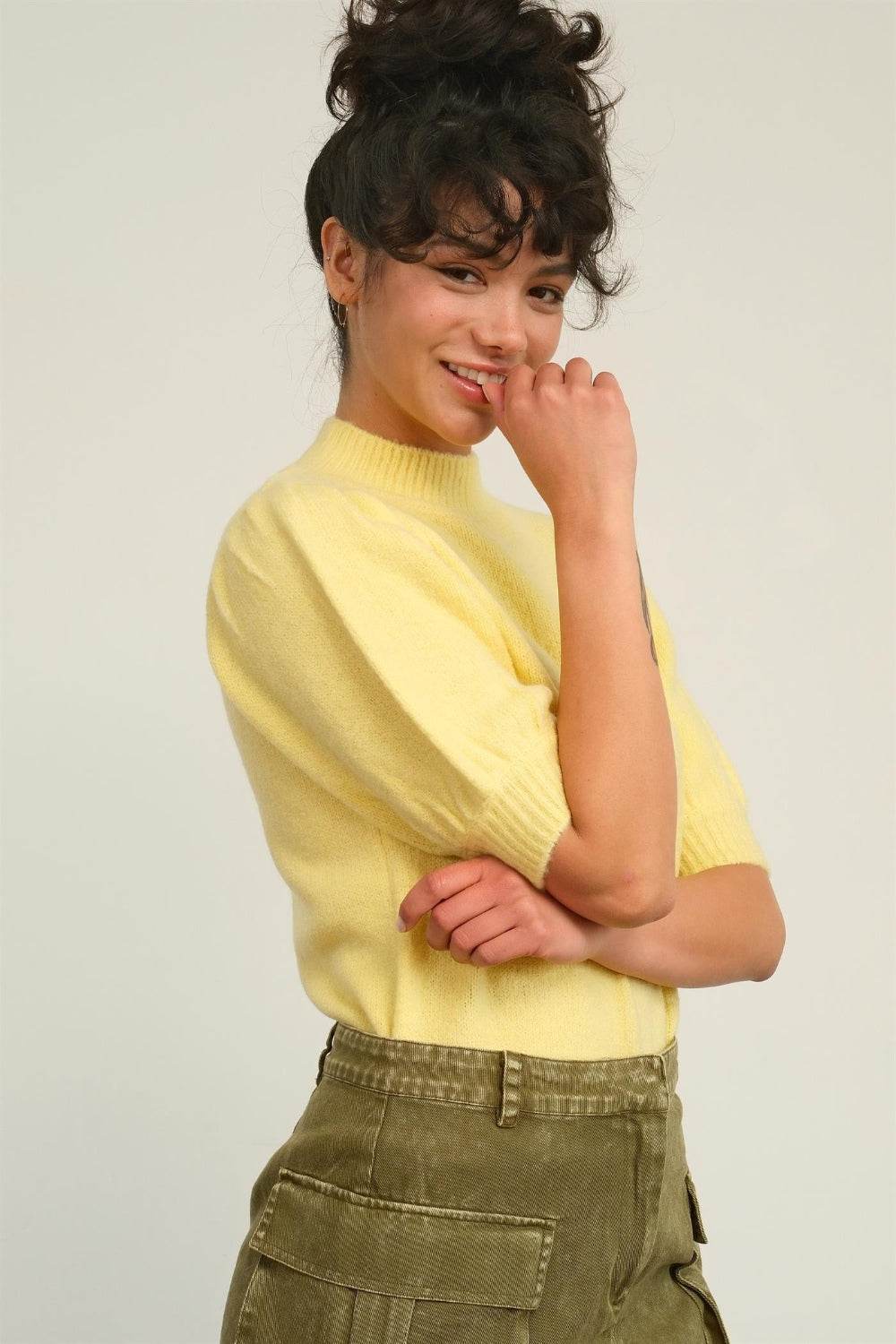 Stay cozy and stylish with this short-sleeve knit sweater. The puff sleeves and ribbed detailing add a fashionable touch to this classic piece. Perfect for layering or wearing on its own, this sweater is a versatile addition to any wardrobe.