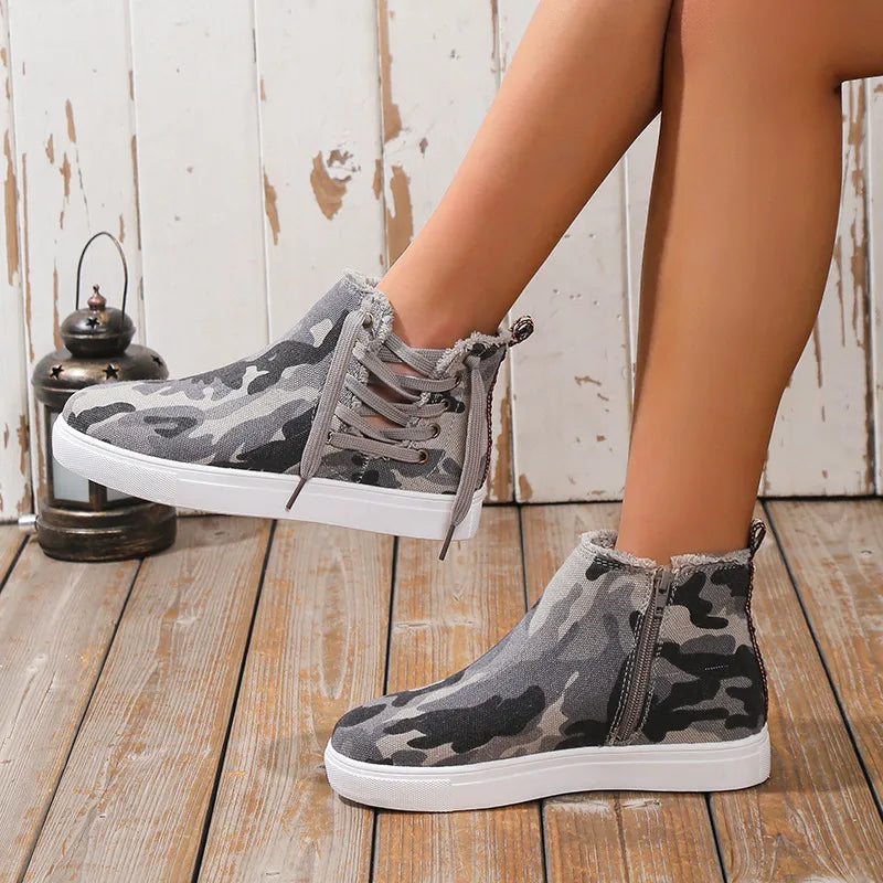 Lace-Up Round Toe Canvas Boots with Side Zip
