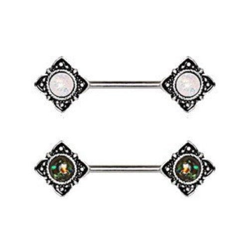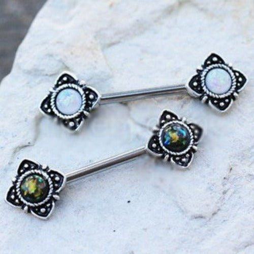 * 316L Stainless Steel Nipple Bar with flower design and synthetic opal