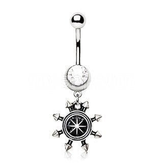 Set sail into an ocean of fashion with this spiked compass dangle Belly Button ring. A radiant sunburst at the center of the compass are surrounded by a circle of arrows.