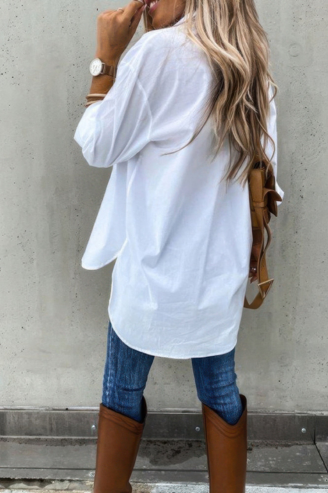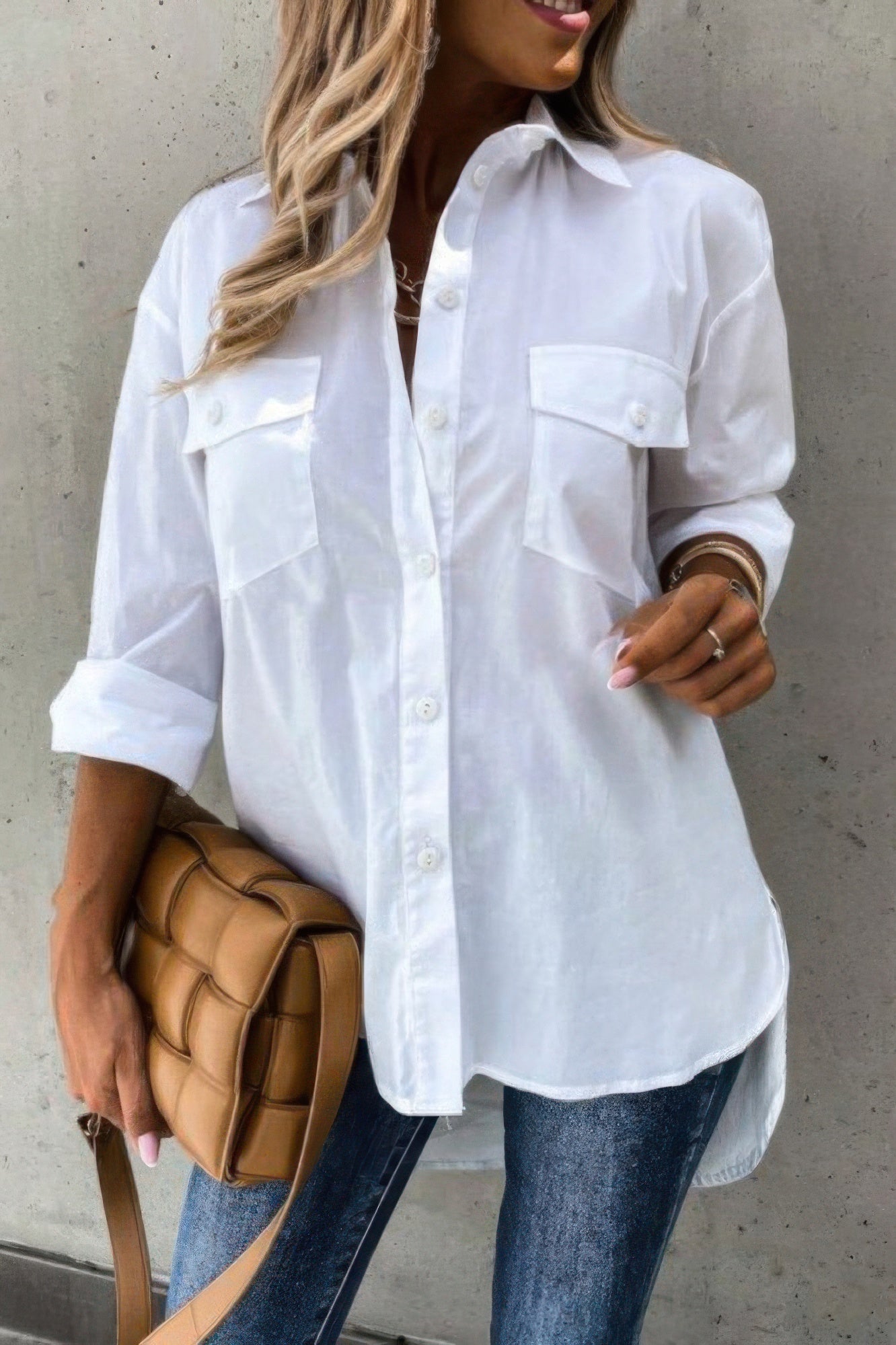 Add timeless style to your wardrobe with this solid button-up pockets long sleeve blouse, designed for effortless versatility and everyday comfort. Made from lightweight, breathable polyester, this blouse features a classic button-front design with practical chest pockets and long sleeves. The relaxed fit makes it easy to dress up or down, perfect for everything from casual outings to work or weekend wear. Pair it with jeans, tailored pants, or skirts for a polished, go-anywhere look.