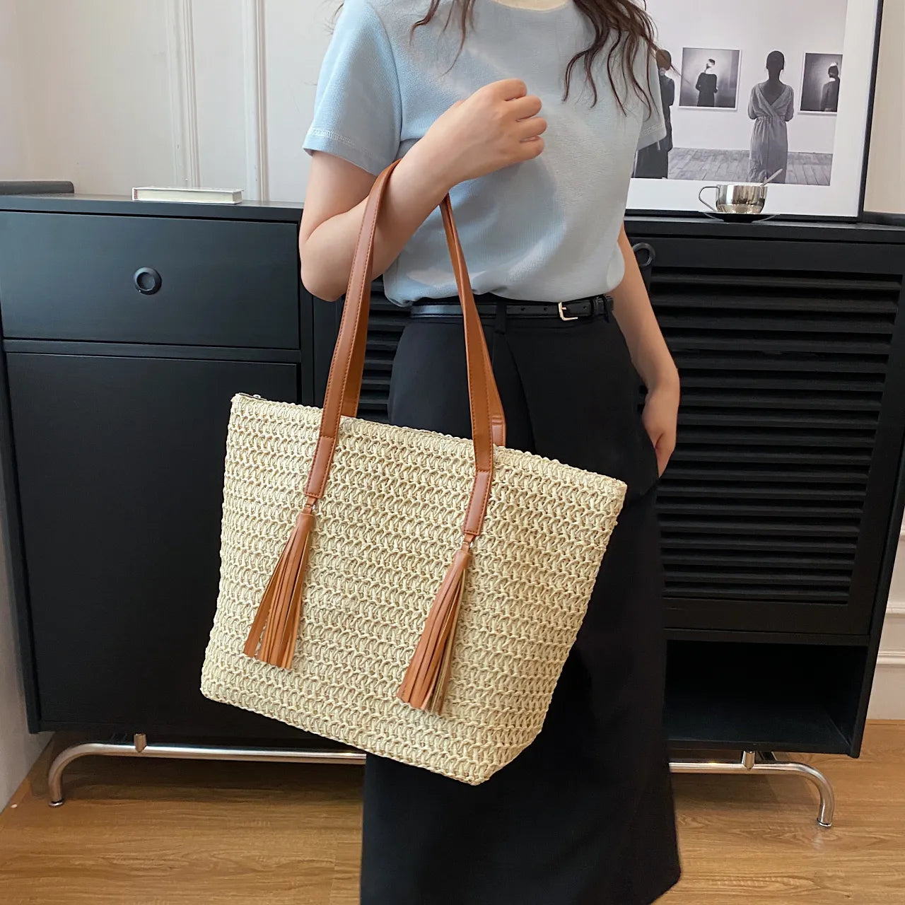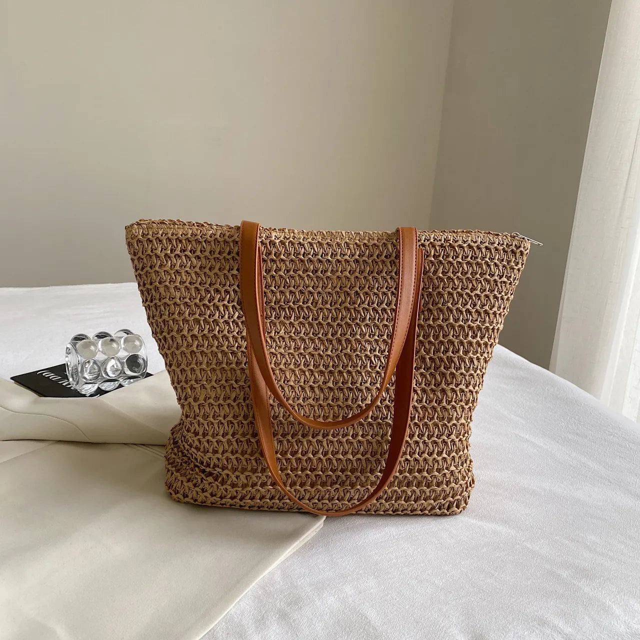 • Woven Straw Tote Bag with Leather Handles Woven Straw Tote Bag with Leather Handles